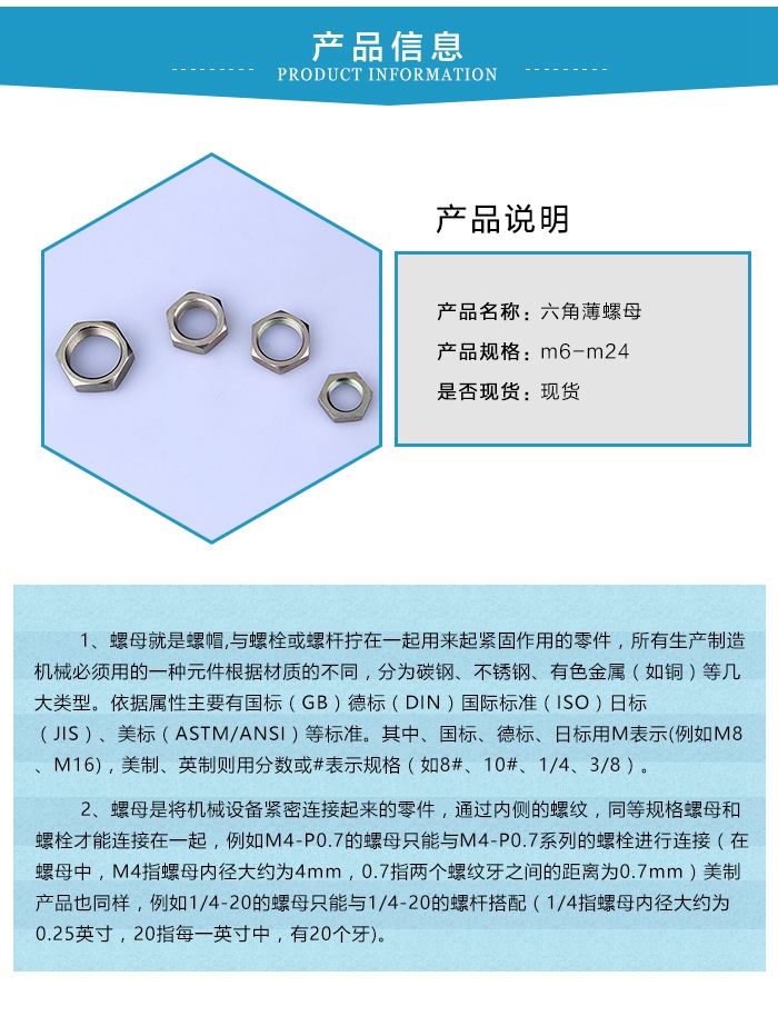 對于六角螺母,常用的標準有:GB52、GB6170、GB6172和DIN934,對于它們之間的主要區別有:GB6170的厚度要比GB52、GB6172和DIN934來的厚,俗稱為厚螺母。