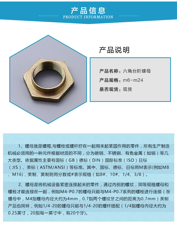 一般的螺母在使用過程由于振動等某種其它的原因會自行松脫,為防止這種現象,于是就發明了六角臺階螺母。