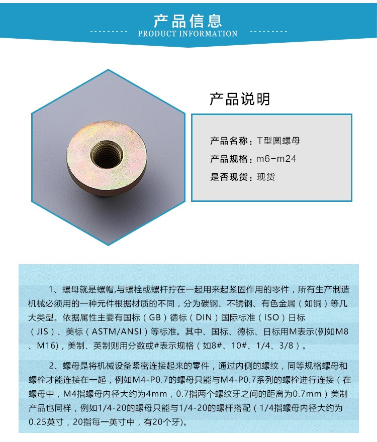 一般有普通六角頭螺母,T型圓螺母的概念比較廣泛,蝶型螺母,自鎖螺母等等,通常用于螺栓的聯(lián)接。小T型圓螺母用于固定傳動(dòng)及轉(zhuǎn)動(dòng)零件的軸向位移,也常配合止退墊圈,鎖緊滾動(dòng)軸承的內(nèi)圈,螺母裝拆需用勾形扳手。