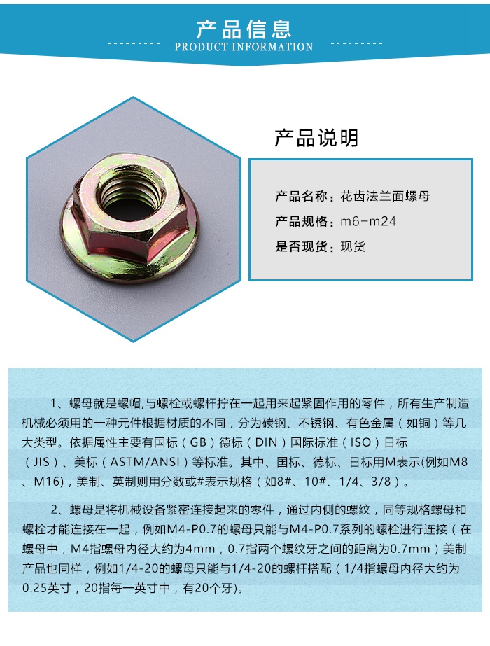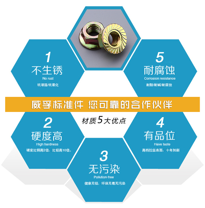 花齒防滑防松螺母的原理:在組裝時,內齒的側面彼此相對,而壓花的外表面的接觸面則咬入兩端。表面之間的相對運動產生提升張力,實現鎖定效果。