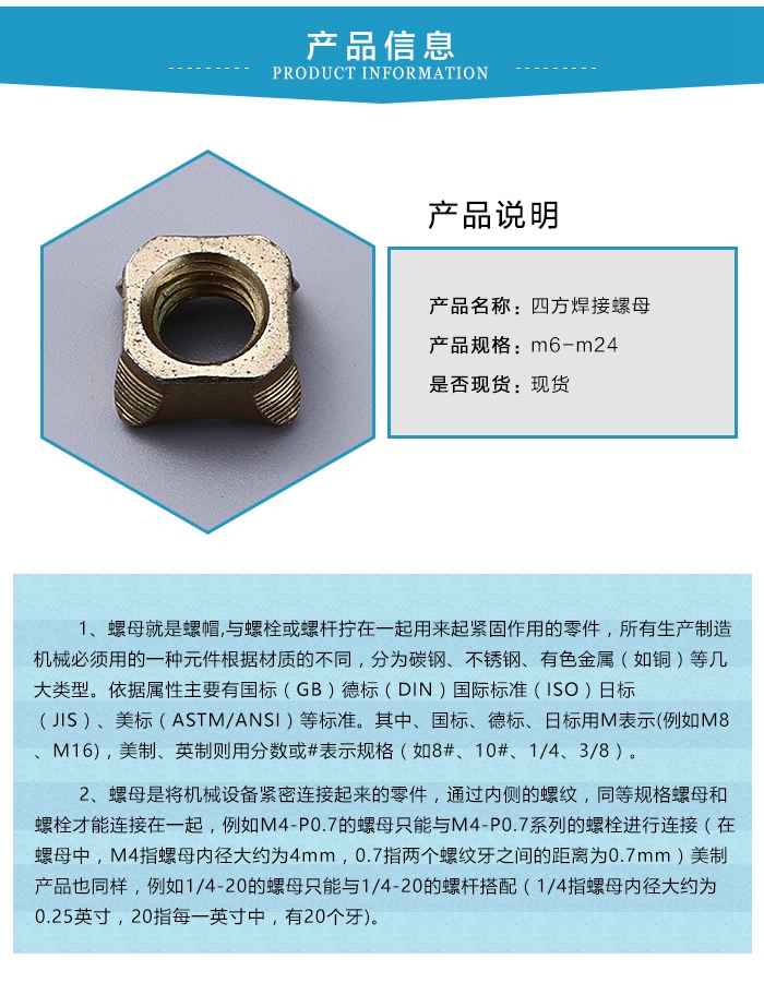 四方焊接螺母是一種在螺母外適合焊接的螺母,一般是可焊接的材料制成的而且較厚適與焊接,焊接是相當于把兩個分離件變成一個整體,用高溫將金屬融化后混合到一起再冷卻,中間會加入合金,內部是分子力的作用,強度一般比母體強度大[1] 。焊接參數的實驗要看焊縫的熔合大小,根據熔合大小調節焊接參數,直到消除缺陷。當然焊接質量的好壞與焊前處理有關,清灰、油漬等。
