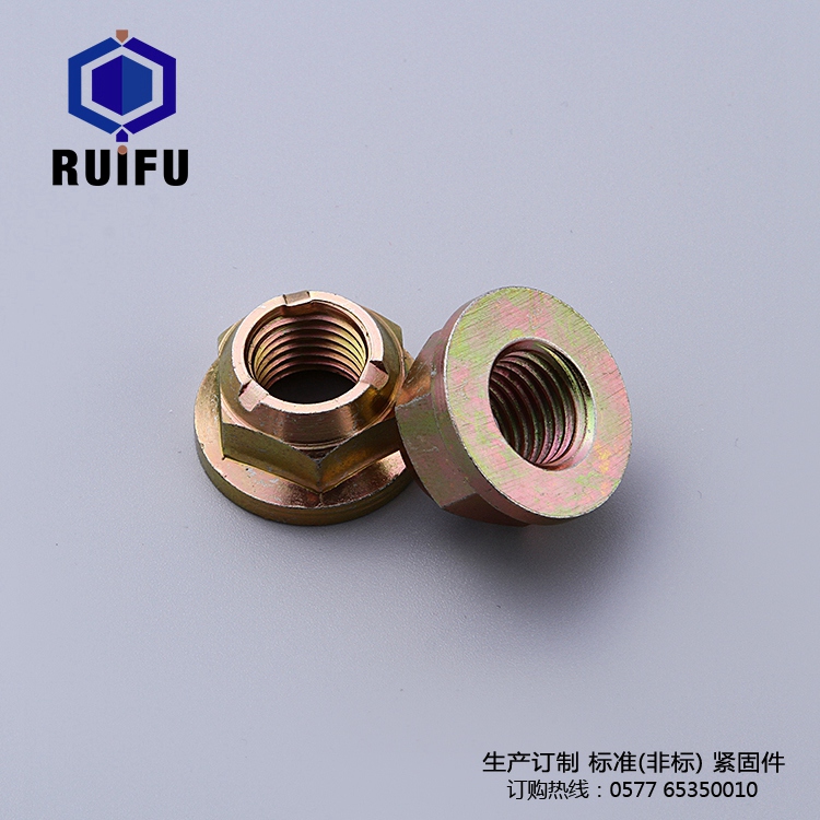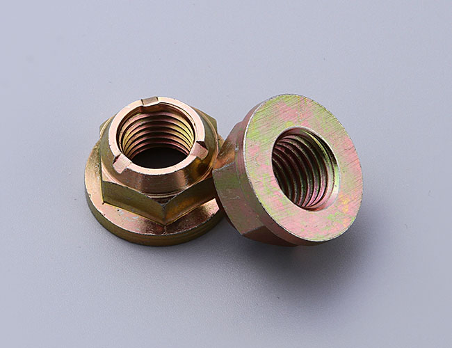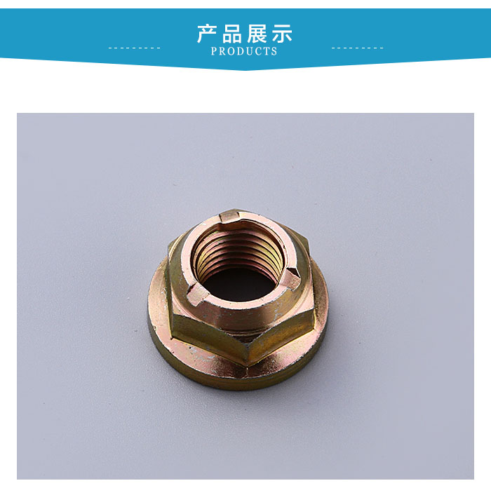 當(dāng)有振動發(fā)生時防松螺母凸起部分相互錯動,產(chǎn)生抬升張力,從而達(dá)到不錯的防松效果。法蘭面壓三點緊鎖螺母有鐵的,也有不銹鋼的。但鐵的比較常用。而且還可以根據(jù)客戶所需要的色彩進(jìn)行電鍍處理。一般電鍍處理有環(huán)保和非環(huán)保的。電鍍有環(huán)保彩鋅,環(huán)保鎳,環(huán)保蘭鋅,環(huán)保黑鋅等,也有普通的電鍍,白鋅,彩鋅,黑鋅,白鎳等。